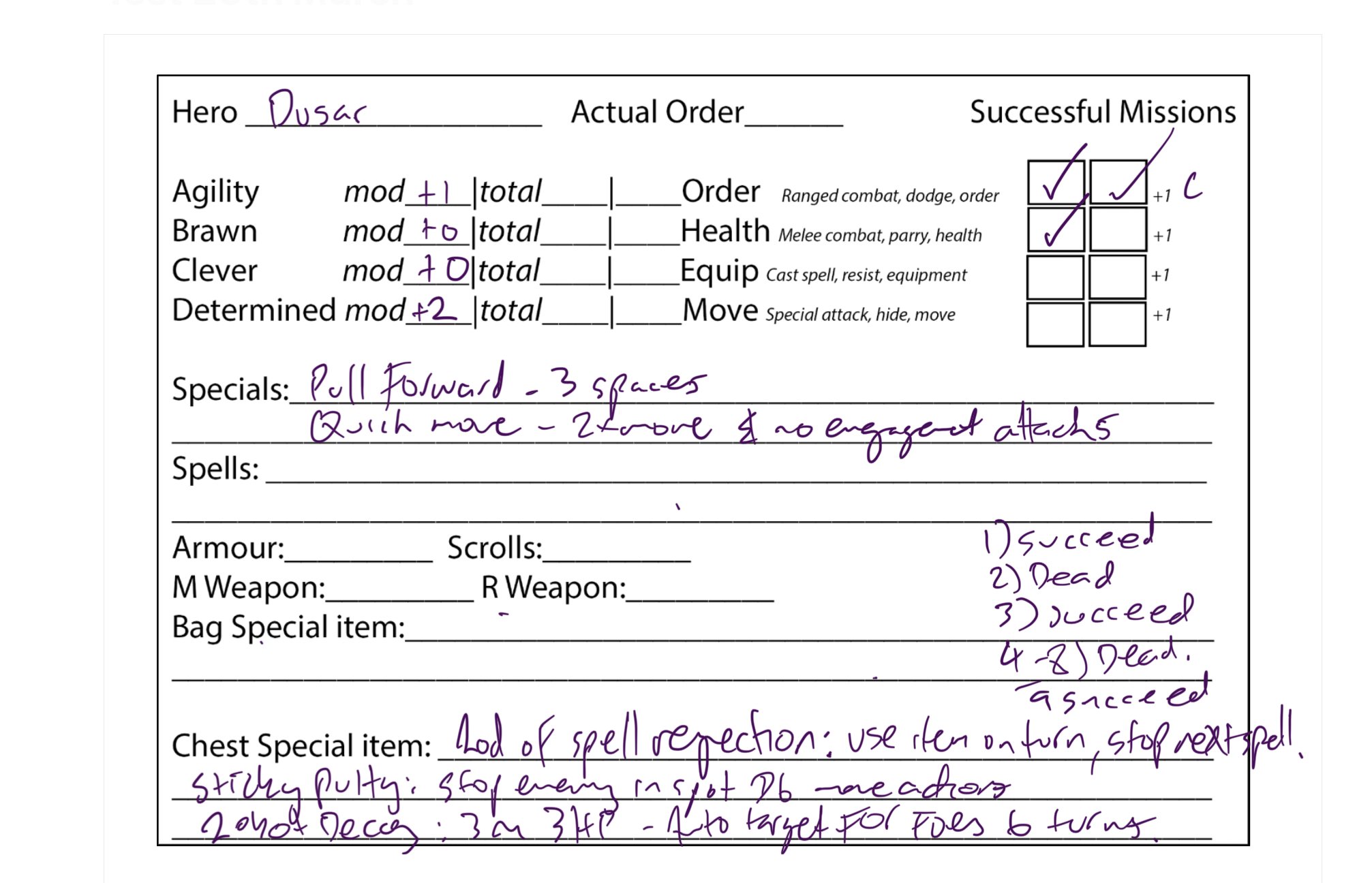 Dusar the Ranger! Some gear that was collected, and the bonus added to scores. He played with higher Determination and Agility, so favouring Hide, Movement, Archery and Specials.