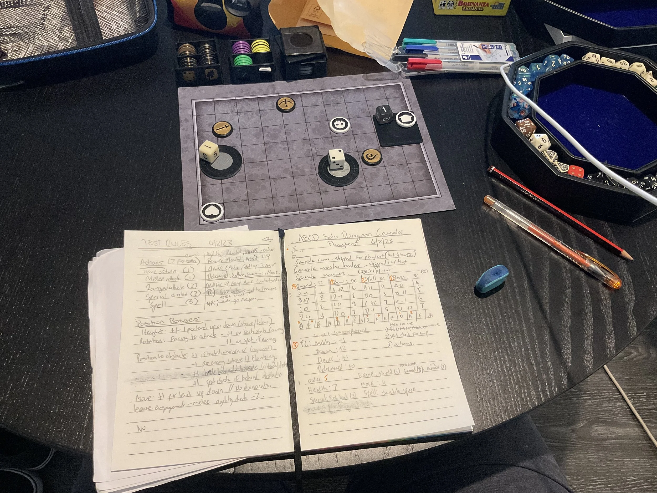I have been using a notebook to track my play tests and initial rule designs. This helped me not be distracted by too much technology while playing. The map pieces and tokens are those found in my usual Game Master kit. Having these mean I can quickly make something that looks decent, and as I don’t plan to sell this for the moment, means I get more use of my cool accessories. I have been making “nicer” reusable templates on my iPad, and making many lists for the next pieces to work on. Digital helps to make things very quickly, much more legible for my hand writing. The lists help me stay focussed on the next thing to work on.