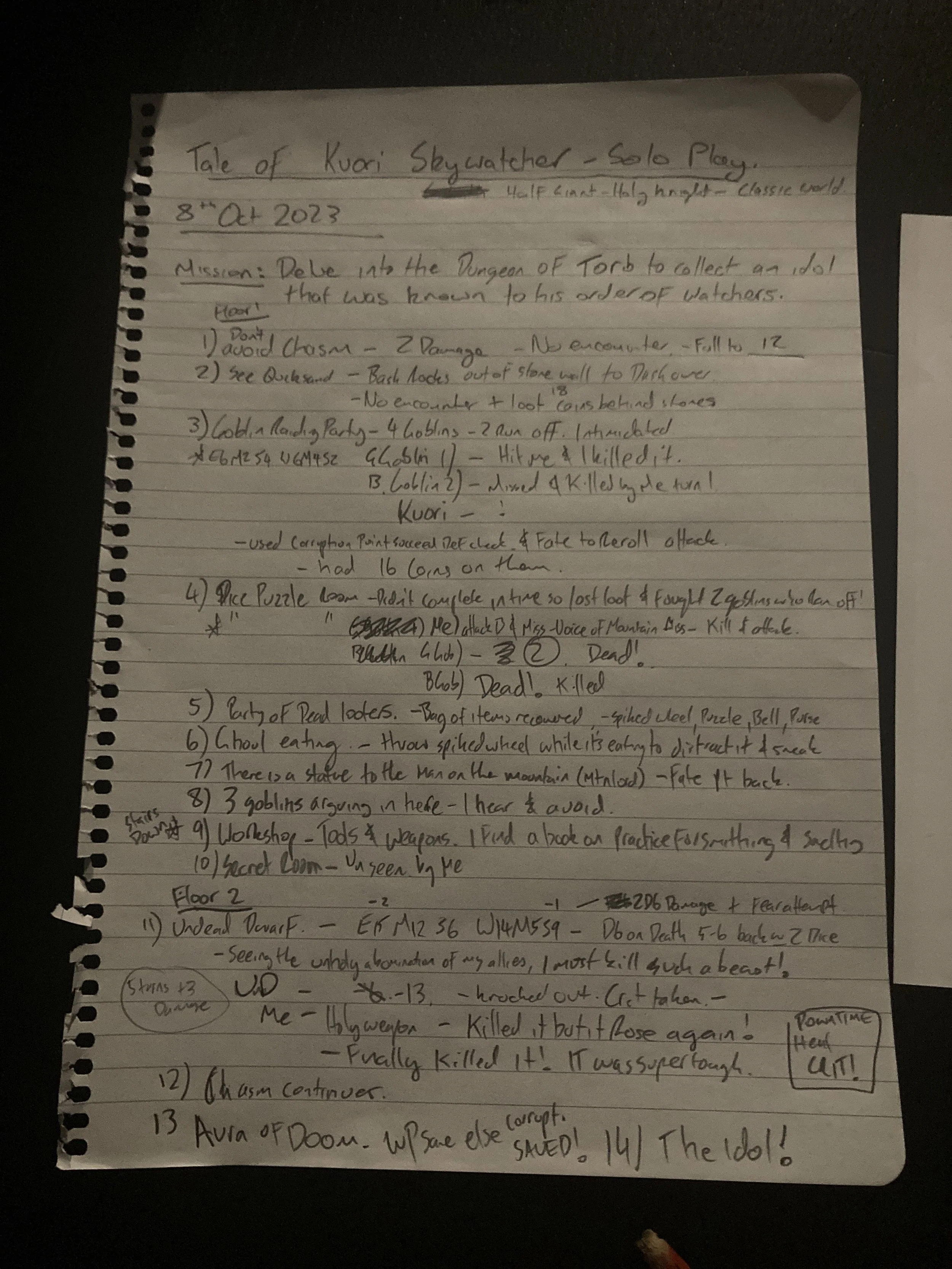 All up I went on nine different adventures. They ranged in theme to exploring known and unknown fictional worlds and environments, meeting NPCs, fighting creatures and more. In order to do this, I thought it was important to keep a simple play log. I wrote down each key encounter and the outcome of what mysterious characters did. The combats were tracked and I tried as much as possible to keep it like a light diary entry. During one adventure I kept a map, but I eventually thought it simply was not necessary for what I needed to do play.